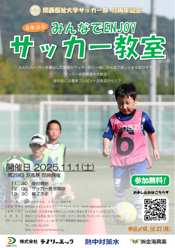 【日程】2025年11月1日(土) ※大学祭と同時開催【場所】関西福祉大学 人工芝グラウンド【時間】11:30受付開始 →13:30頃終了予定【対象】赤穂市の小学生【費用】参加無料【申込】QRコード(Googleフォーム)より【〆切】2025年11月27日(月)